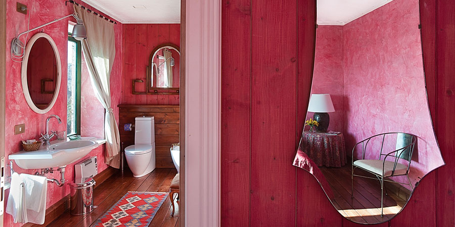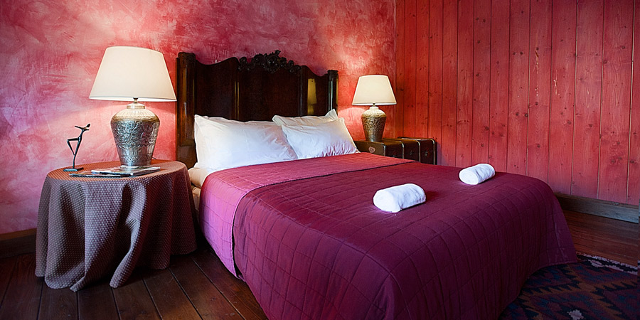 Double bed. Nice scenic windows overlooking the garden. Floors and walls in solid wood, very colourful. Vintage furnishings...