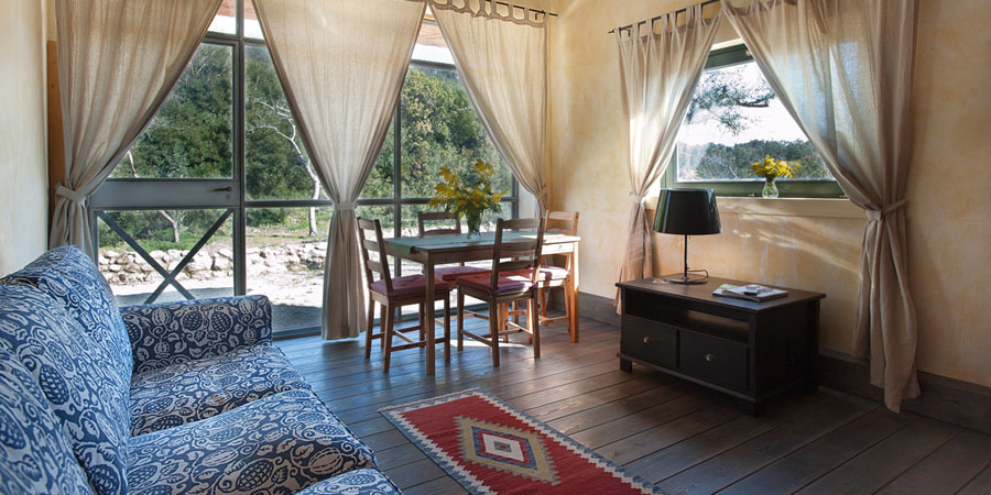 Family Suite with living room, panoramic windows, and own garden. Loft with double bed. 2 single bunk beds in alcove...