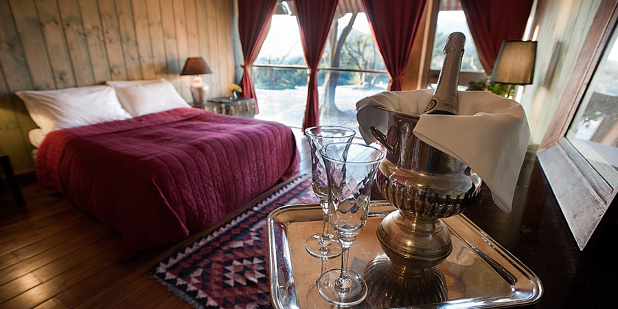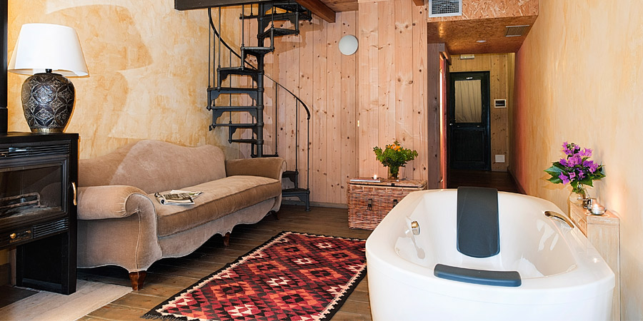 Suite with a vintage design, this spacious suite features a two-seater spa bath, hardwood floors and forest views...